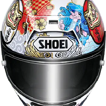 Shoei X-SPR Pro, în decorul Marquez Motegi5 TC-6, este o cască integrală sport-racing dezvoltată în tunel aerodinamic, cu cochilie AIM+, EPS cu densități multiple, ventilație 7 intrări / 6 evacuări, stabilizator spate și vizieră CWR-F2R cu Pinlock.