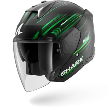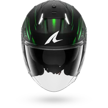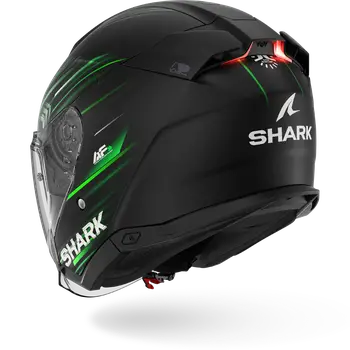 Casca moto open-face SHARK SKWAL i3 JET LIGHT-BLUR, în combinația Negru Mat / Verde / Alb, este gândită pentru vizibilitate ridicată în trafic, cu iluminare Full LED integrată și stop activat de accelerometru triaxial, fără cabluri.